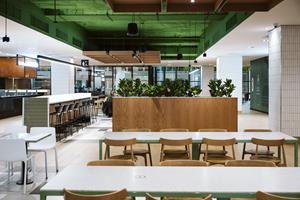 La verrière de l’aire de restauration laisse la lumière circuler et rehausse le design moderne et chaleureux du nouvel espace.